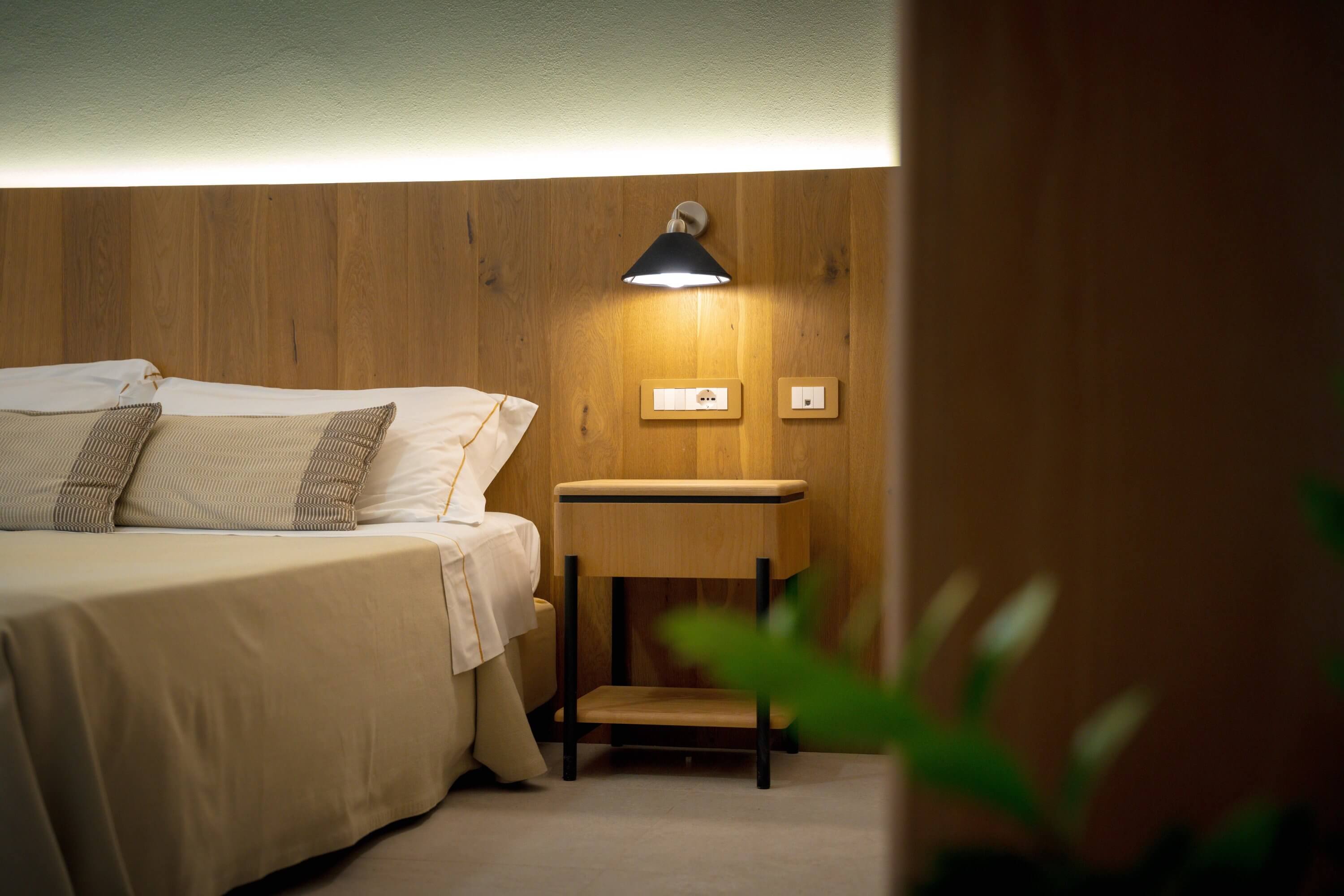 Gli arredi in legno chiaro e i toni naturali creano un’atmosfera armoniosa, mentre il balcone privato invita a concedersi un momento di quiete all’aperto.