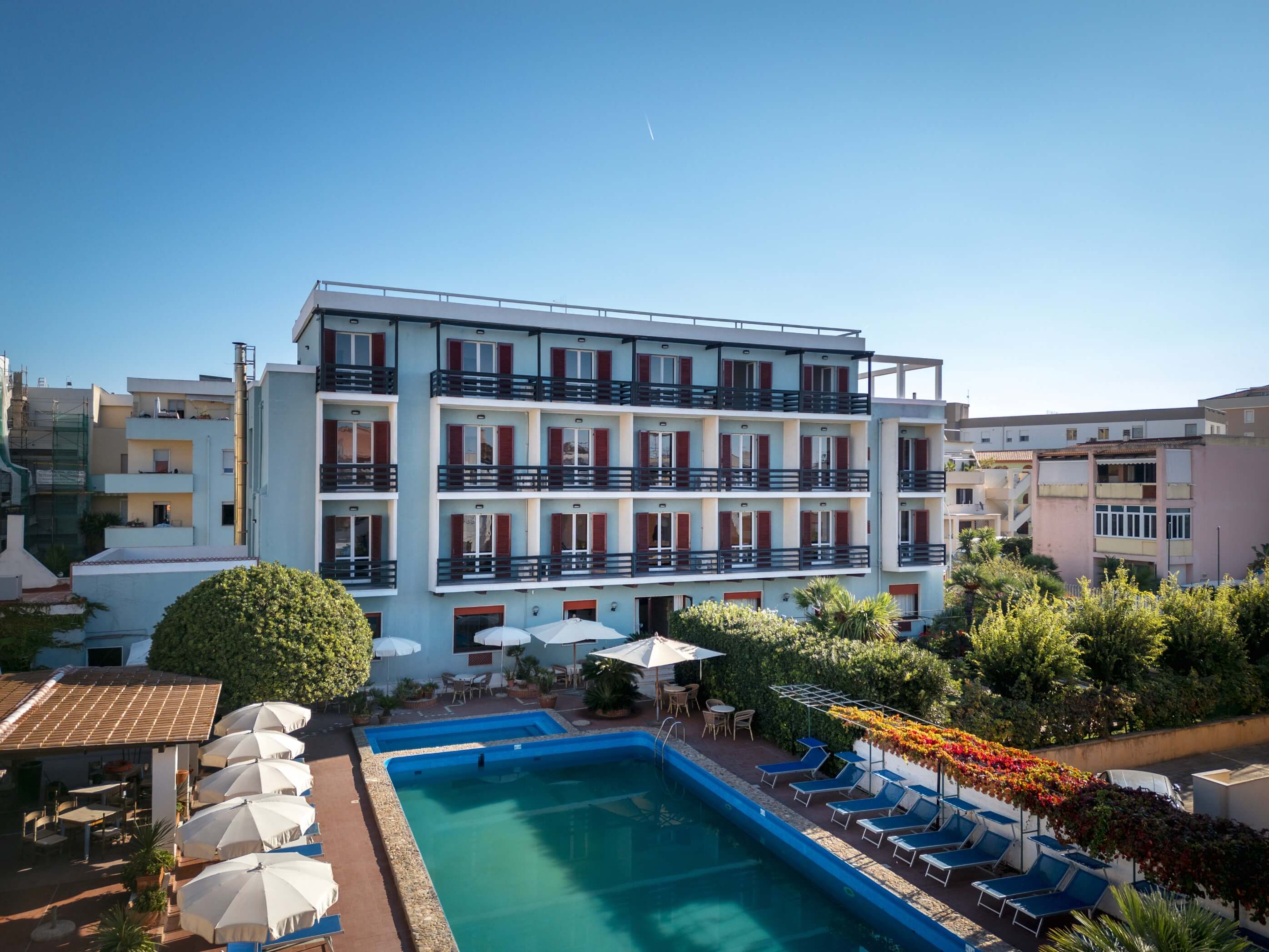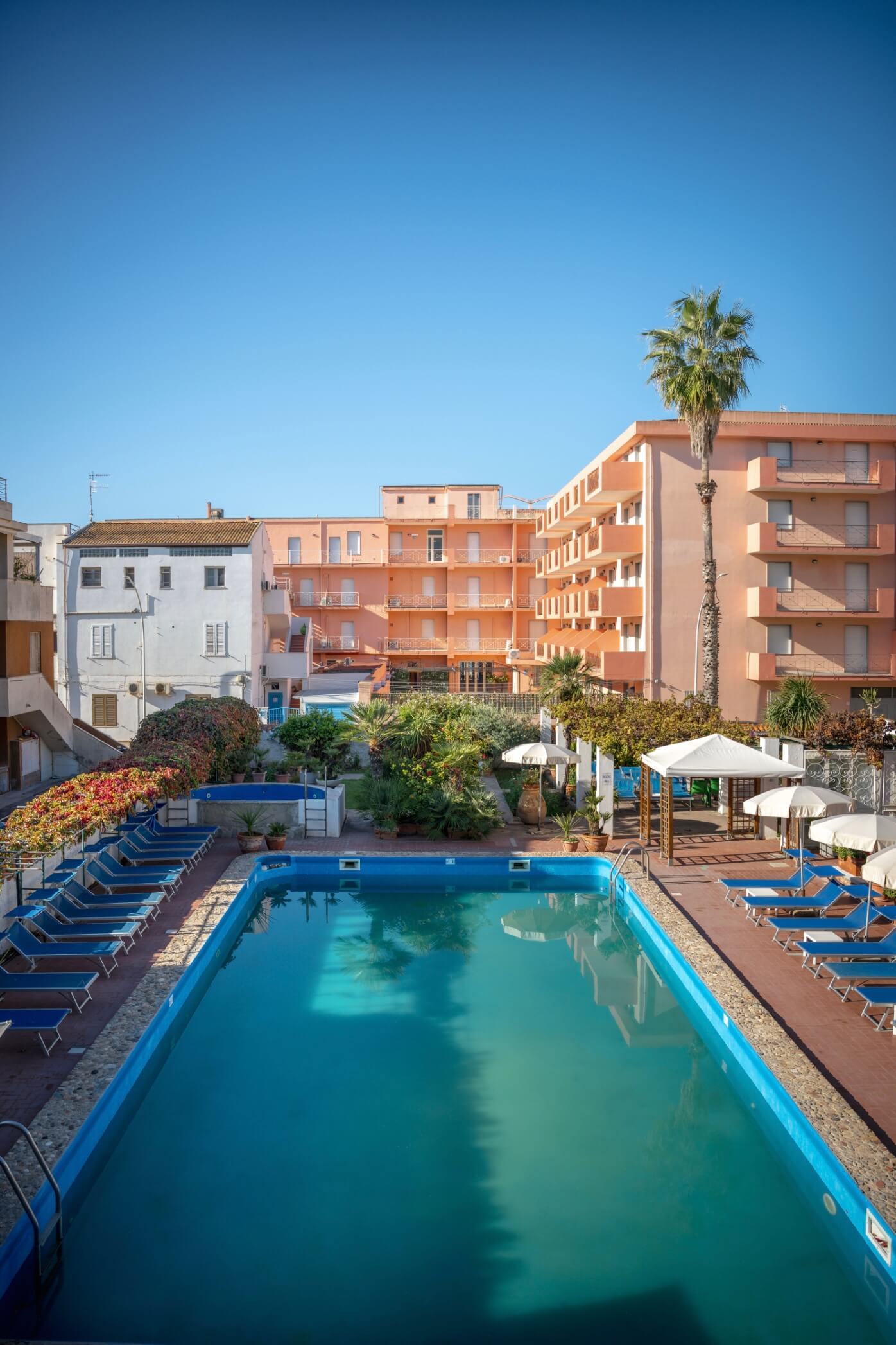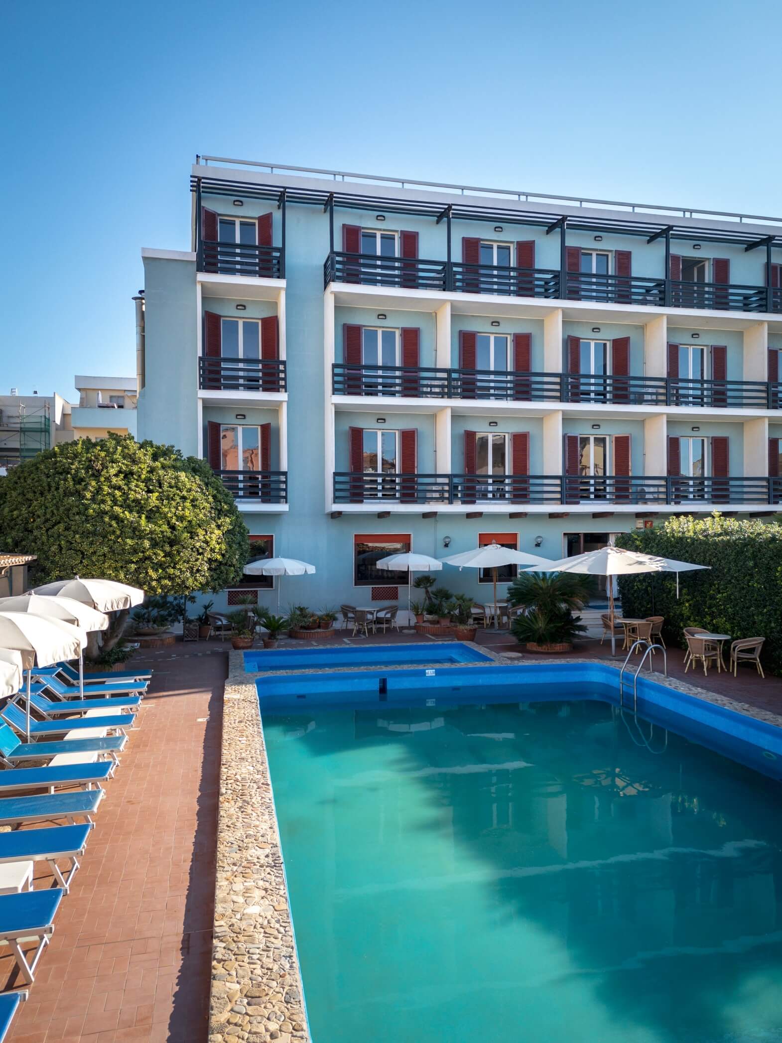 Al suo interno, la piscina è attrezzata con sdraio e ombrelloni, perfetta per godersi il sole o un momento di relax dopo una giornata di mare.